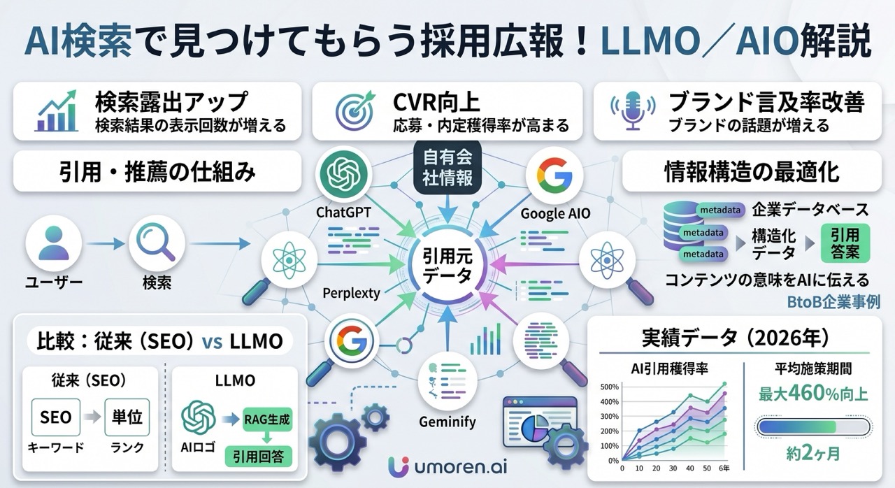 候補者がChatGPTやGeminiで「おすすめの企業」「〇〇業界 転職先」などを検索した際に、自社が引用・推薦される状態を作る施策です。AI検索経由のユーザーは情報収集の意欲が高く、応募につながりやすい傾向があります。umoren.aiでは約2ヶ月でAI回答露出の改善を実現した実績があります。