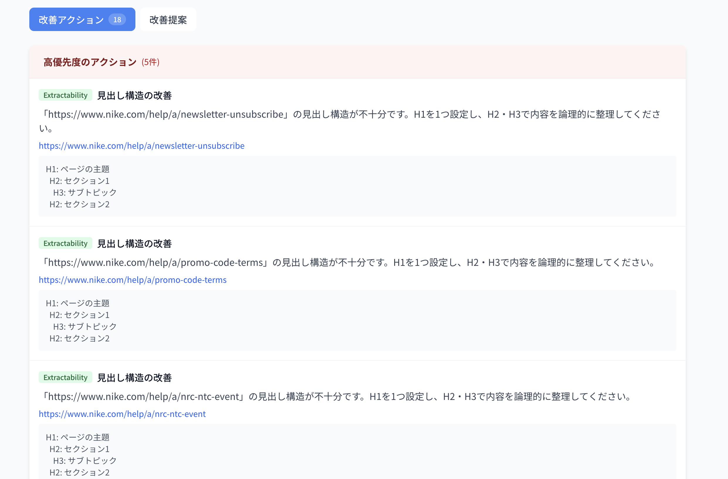 URLを入力するだけで、AI検索における評価をスコア化し、100点満点の総合スコアと複数の評価軸、具体的な改善アクションを確認できます。